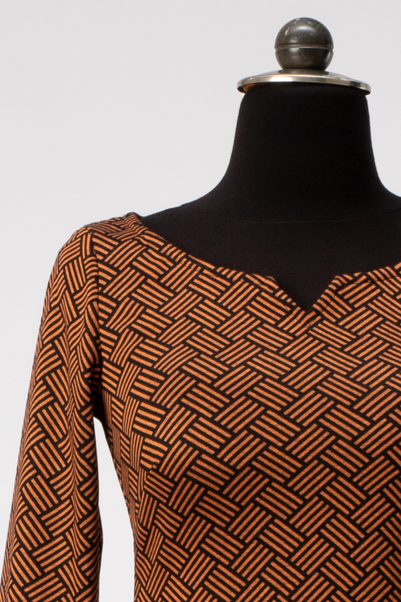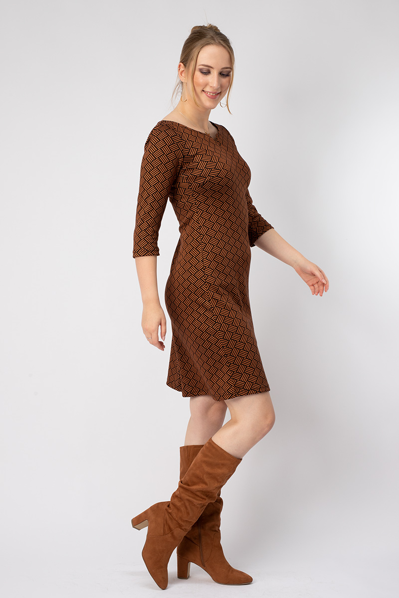 Kleid AUDREY zeichnet sich durch einen geradlinigen Schnitt in leichter A-Form aus. Der Halsausschnitt ist oval mit einem dekorativen „V“ in der Mitte.
