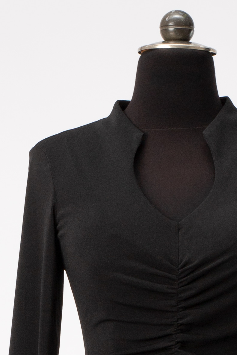 Es ist figurbetont aber nicht hauteng. Die Raffung im Vorderteil kaschiert gekonnt die eine oder andere weiblichen Rundung. Der Rock ist schmal und hat vorne einen Schlitz.